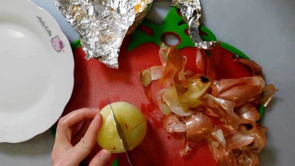グリルで焼いた玉ねぎは皮を剥いて、縦と横に切れ目を入れます。