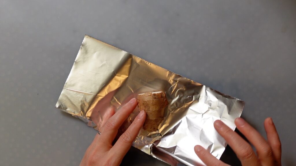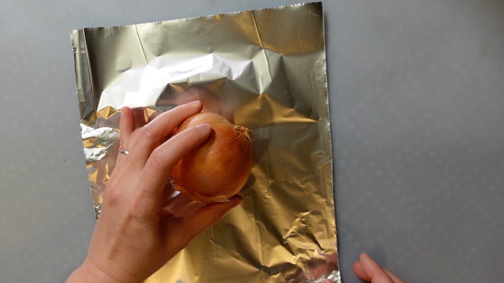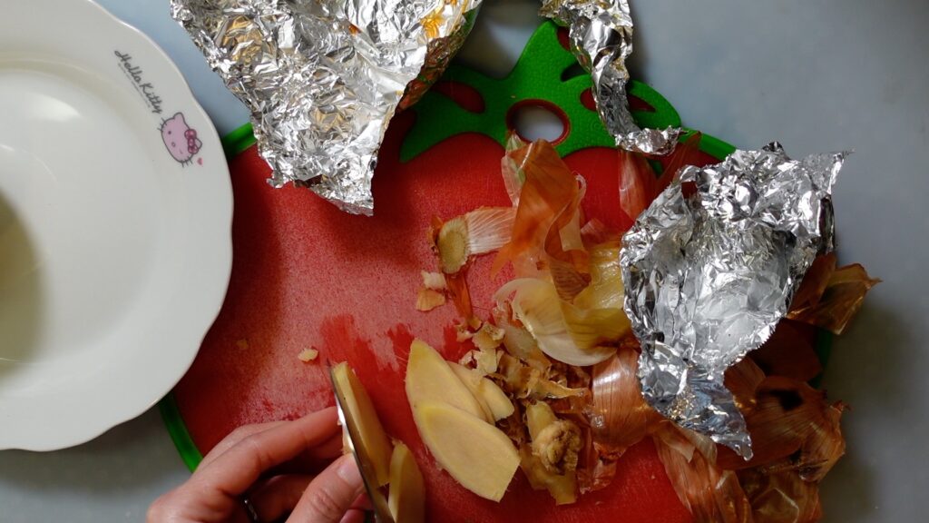 玉ねぎ1個と生姜1個をアルミホイルで包み、グリルで15分ほど焼きます。