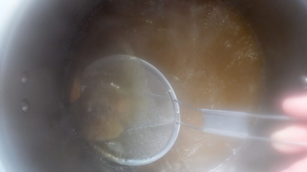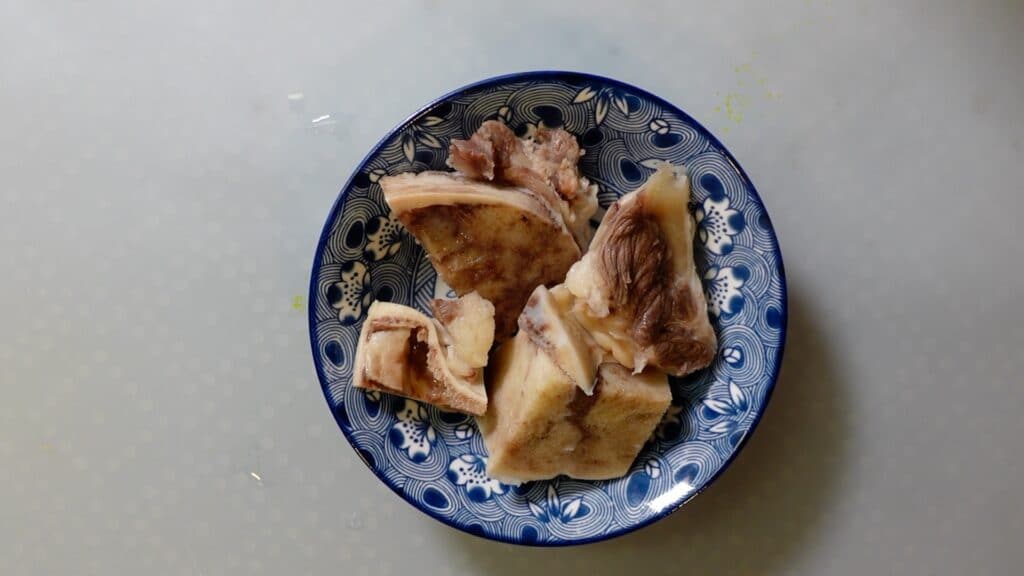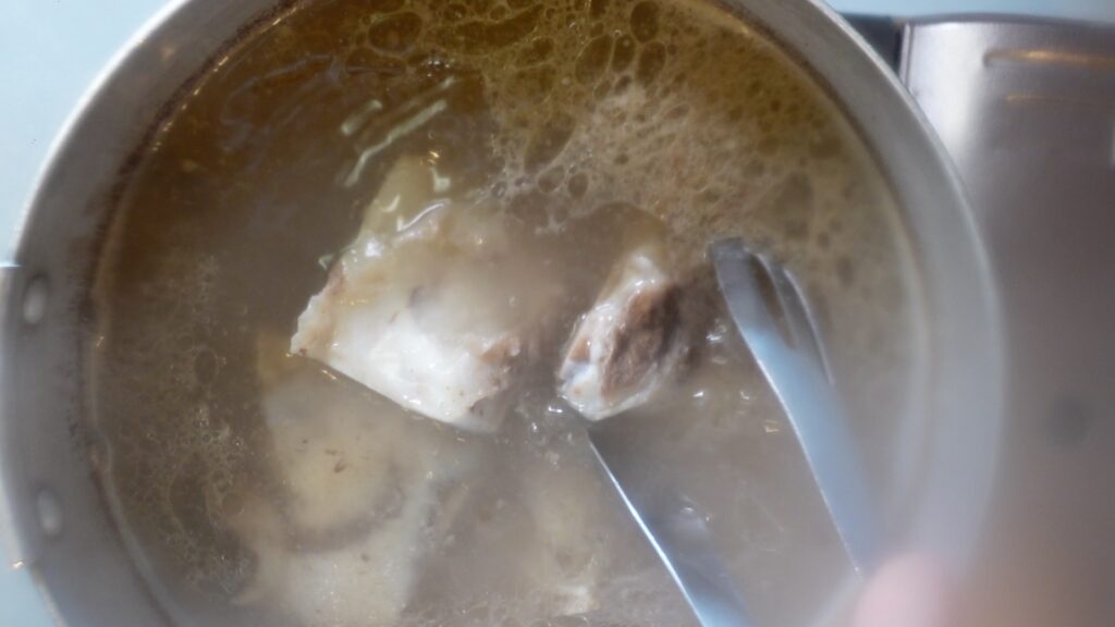 沸騰してから5分ほどしたら火を止め、牛骨を取り出します。