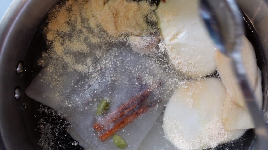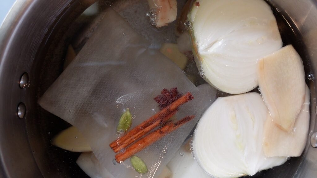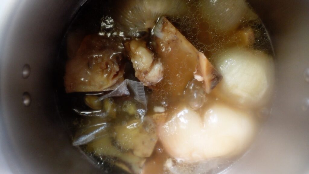 下準備した玉ねぎ、生姜、だしパックを入れます。