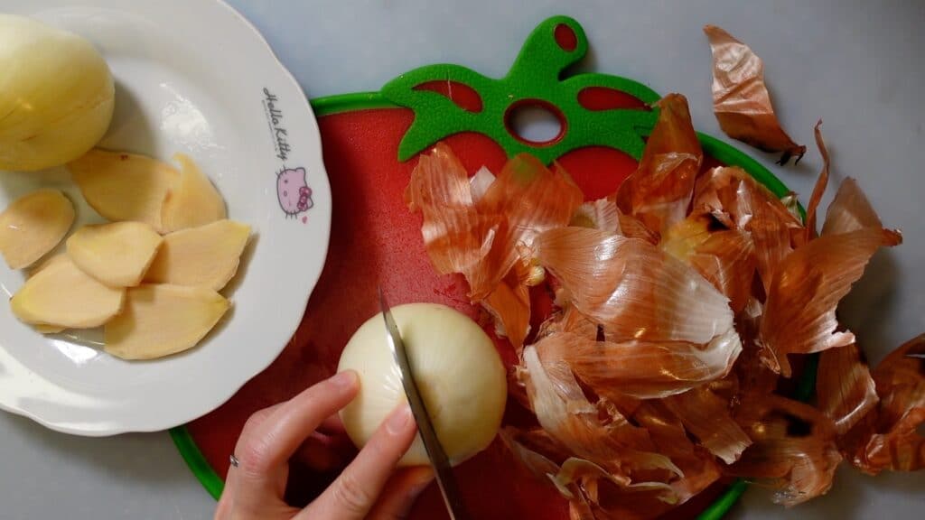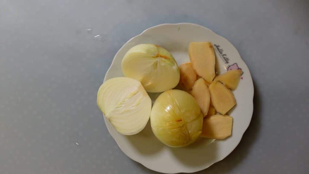 生の玉ねぎは皮を剥いて2つに切ります。