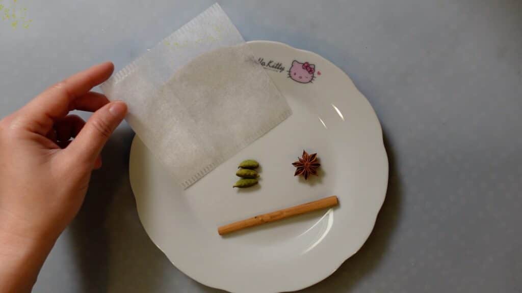 シナモンスティック、スターアニス、カルダモンをだしパックに入れます。
