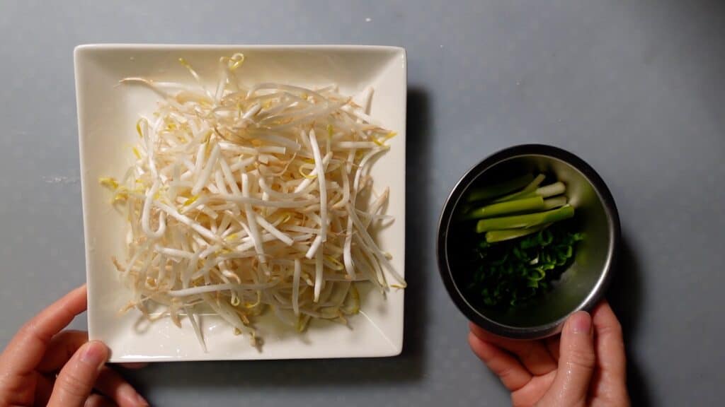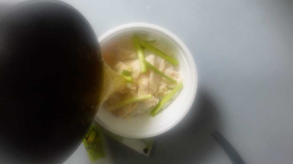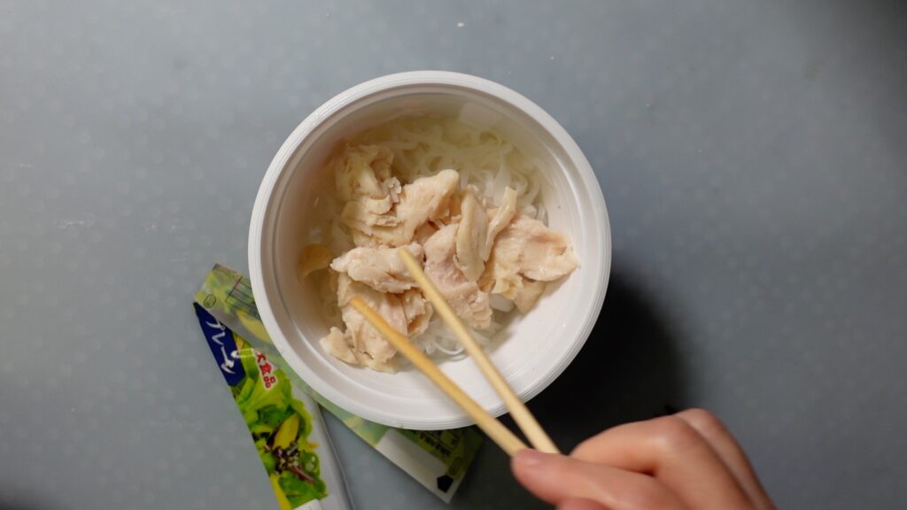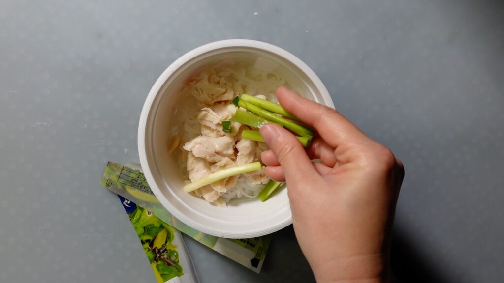 本格的なフォーに近づけるために、鶏肉とネギを入れます。そこに熱々のスープをかける必要があるからです。