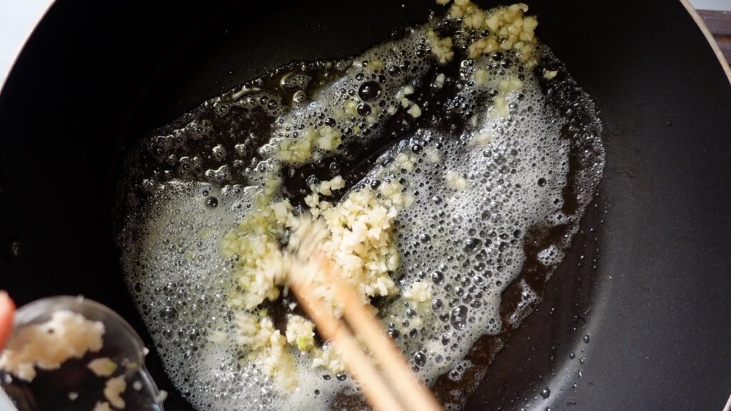 しっかり混ぜ合わせ、ニンニクが焦げる前に火を止めます。