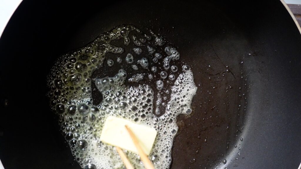 バターが溶けたら、細かく刻んだニンニクを入れます。