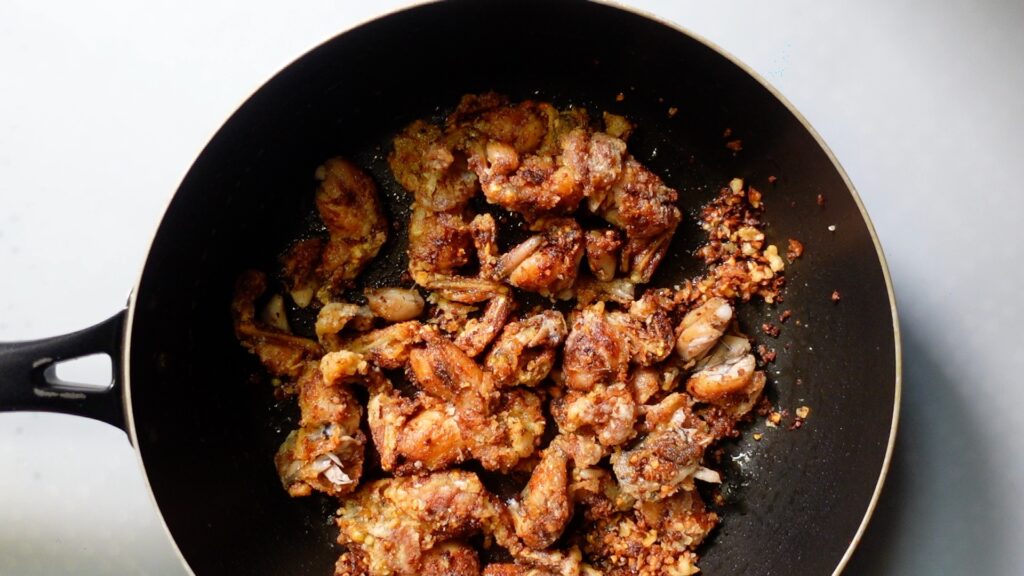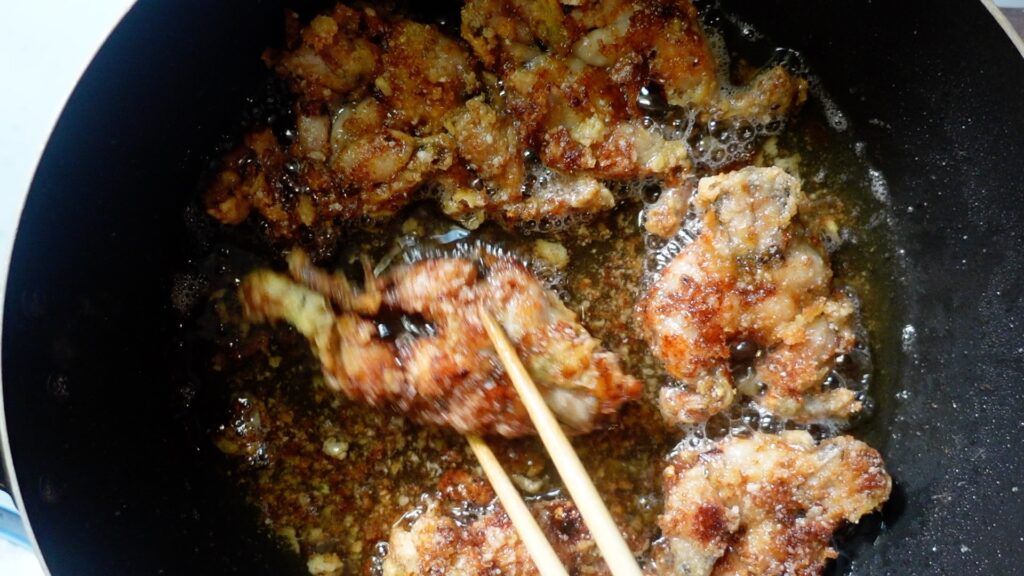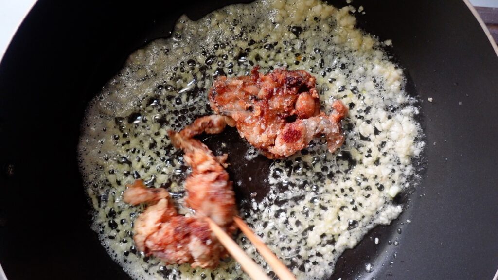 ニンニクの香りが出てきたら、揚げた蛙を入れます。