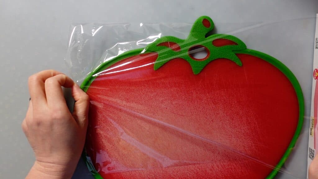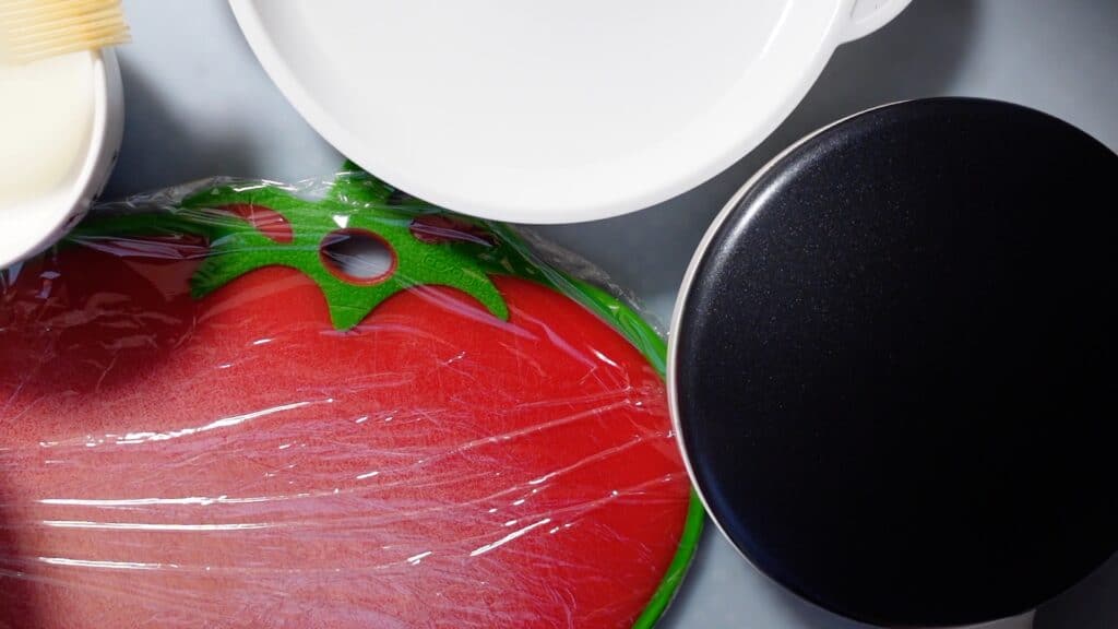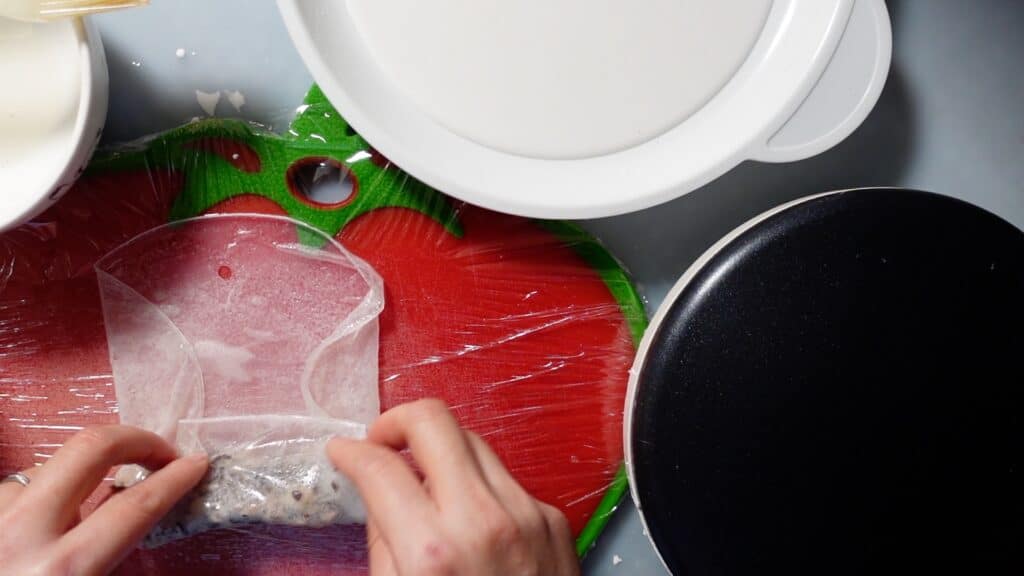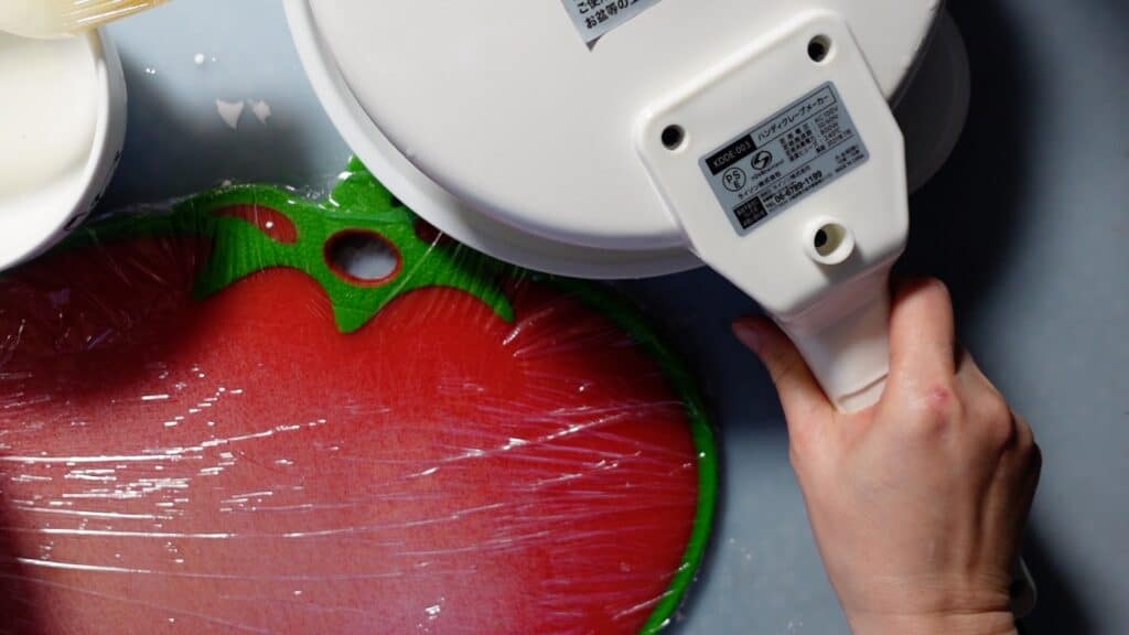まず、まな板にラップをかけます。
