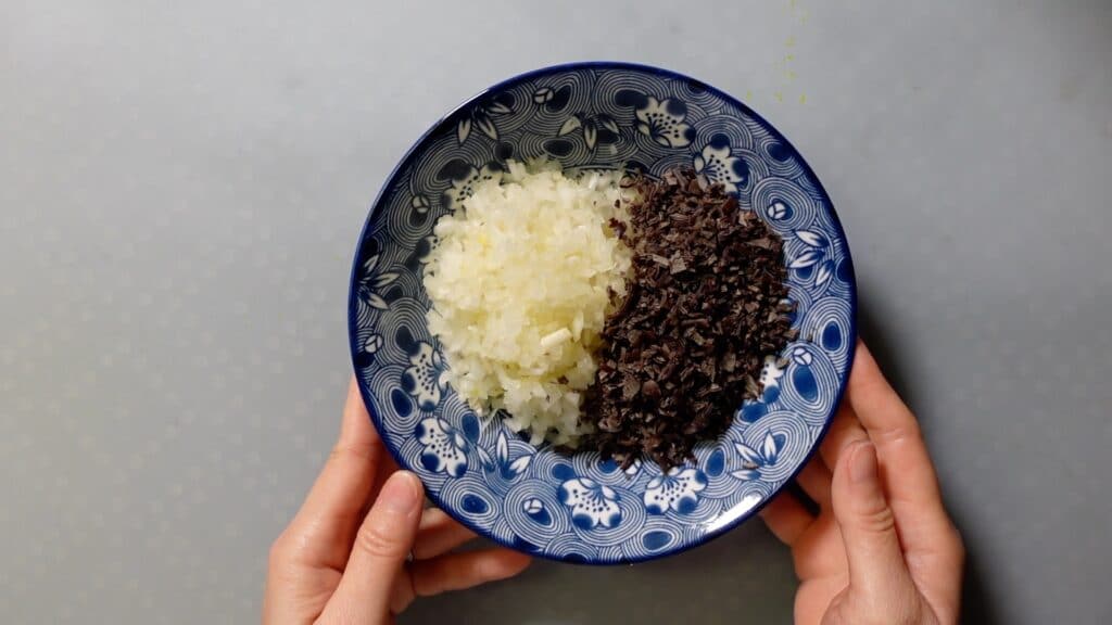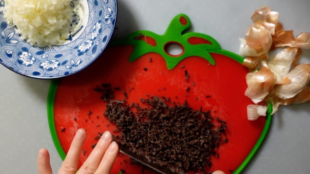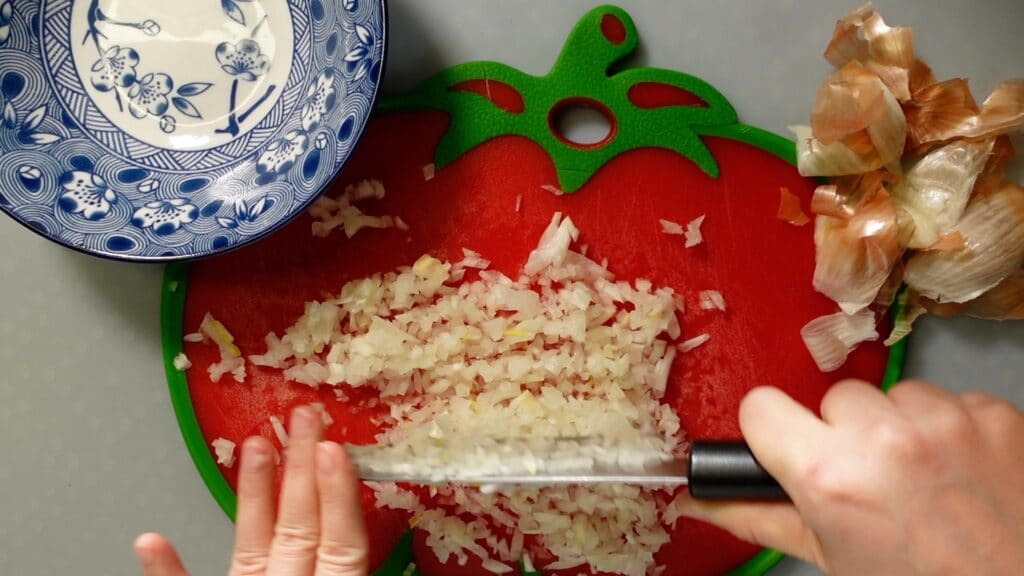 キクラゲをもどすのに15分ほどかかるので、その間に玉ねぎ1個を細かく刻んでしまいます。