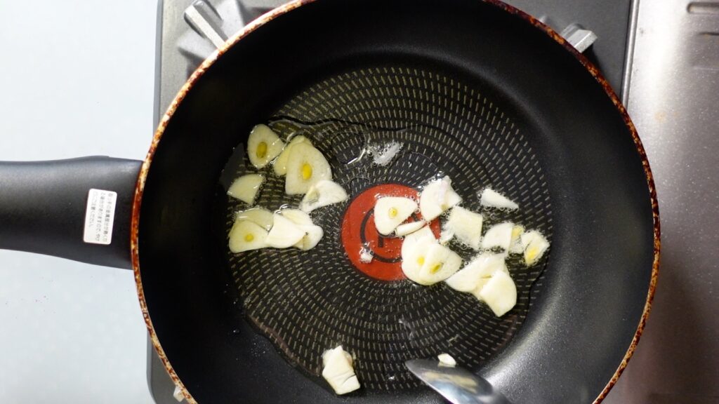 フライパンに油を敷き、スライスしたニンニクを炒めます。