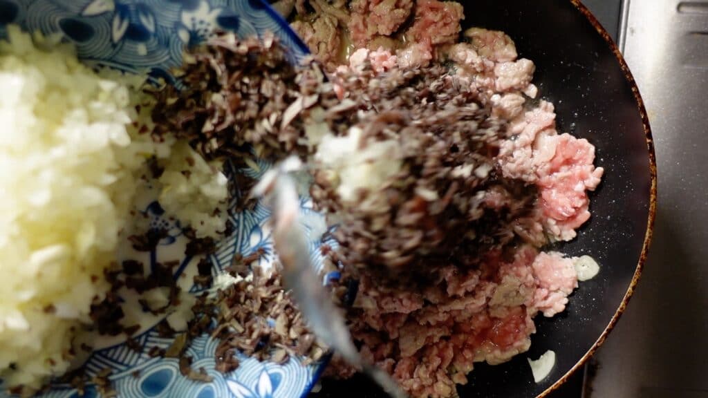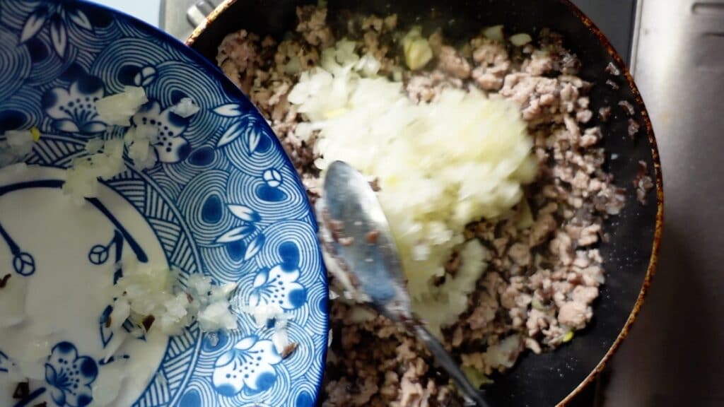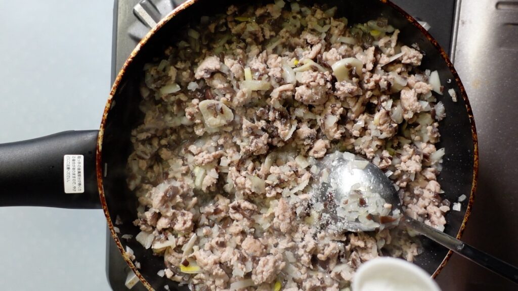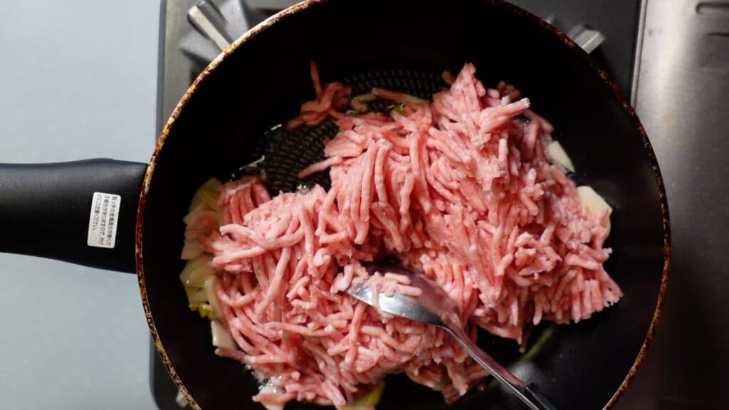 香りが出てきたところで、豚ひき肉200グラムを入れます。