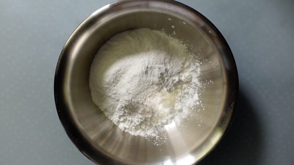 ボウルにタピオカスターチ130グラム、上新粉70グラム、塩少々を入れます。