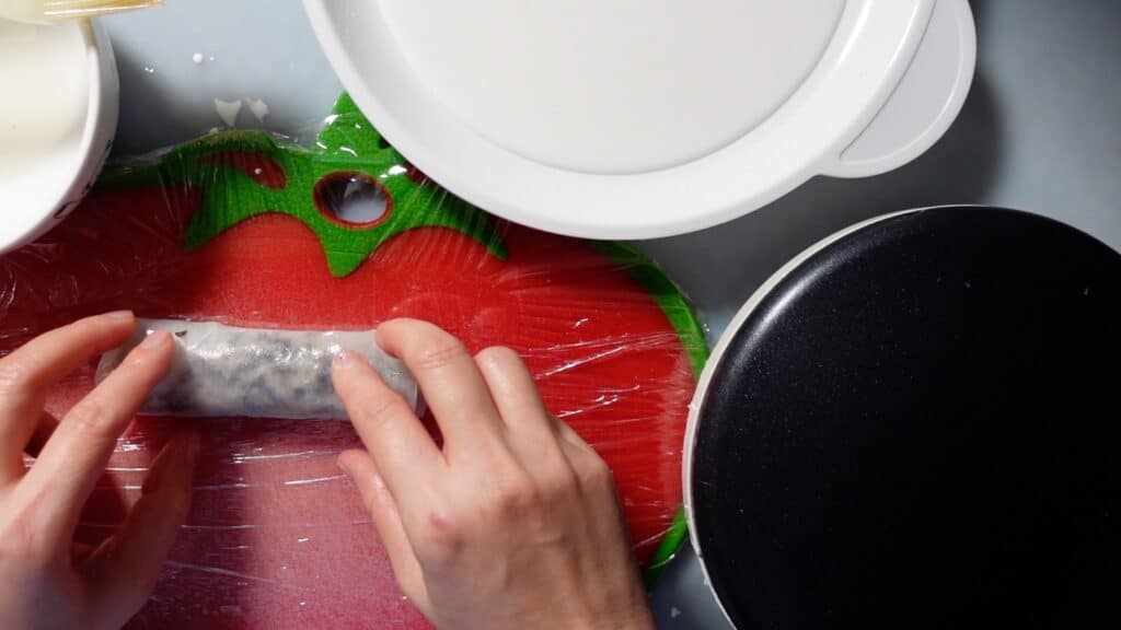 この時失敗することもありますが、落ち着いて生地を広げましょう。生地はまだ柔らかく、まな板にはラップが巻いてありますので、修復が可能です。
