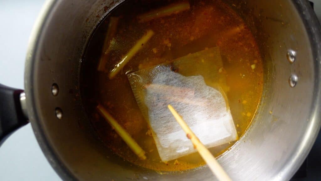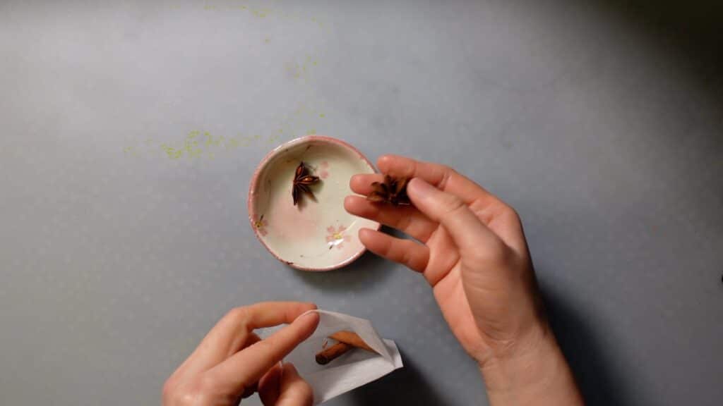 だし袋にシナモンスティック1本、スターアニス2個を入れます。