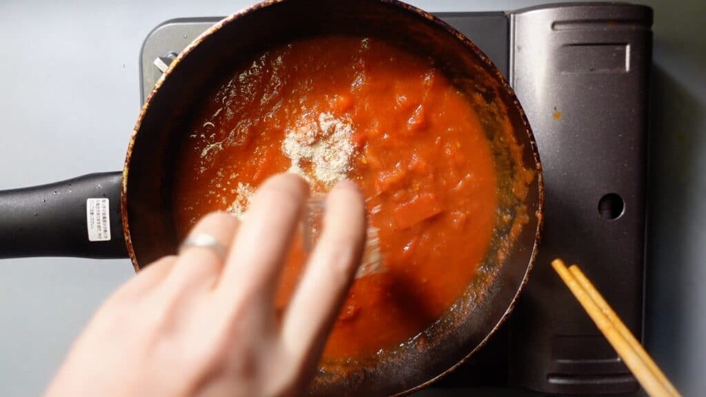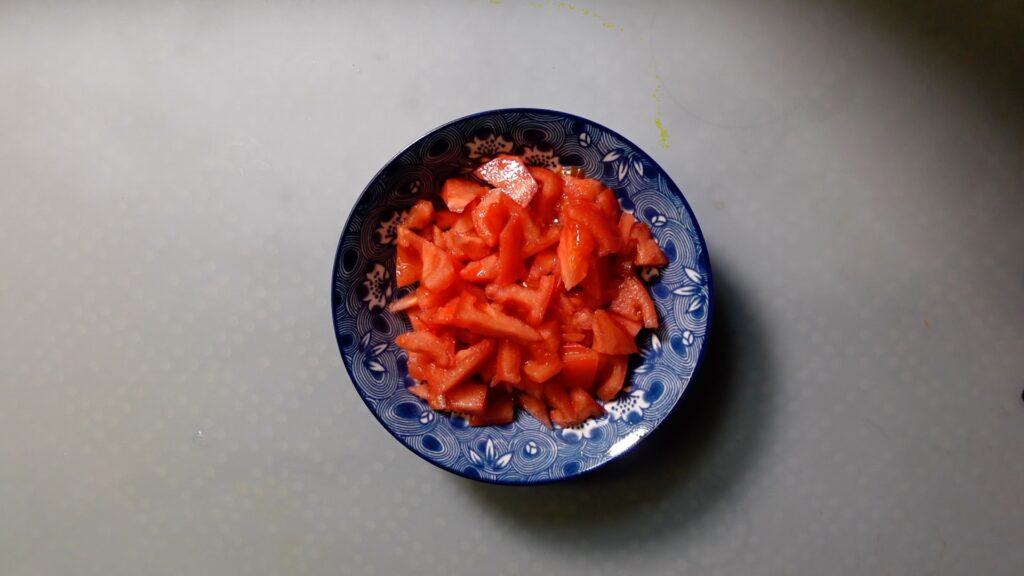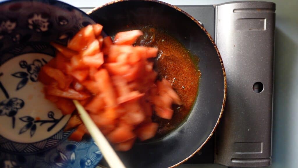 油とパプリカパウダーがよく混ざったら、刻んだトマトを入れます。