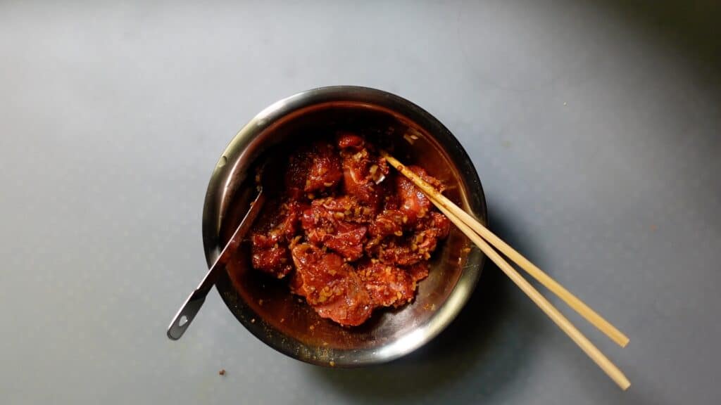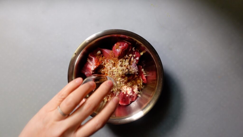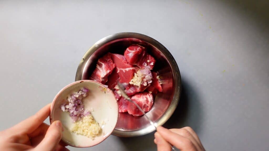 牛肉をボウルに入れ、みじん切りしたホムデンとニンニクの半分を入れます。