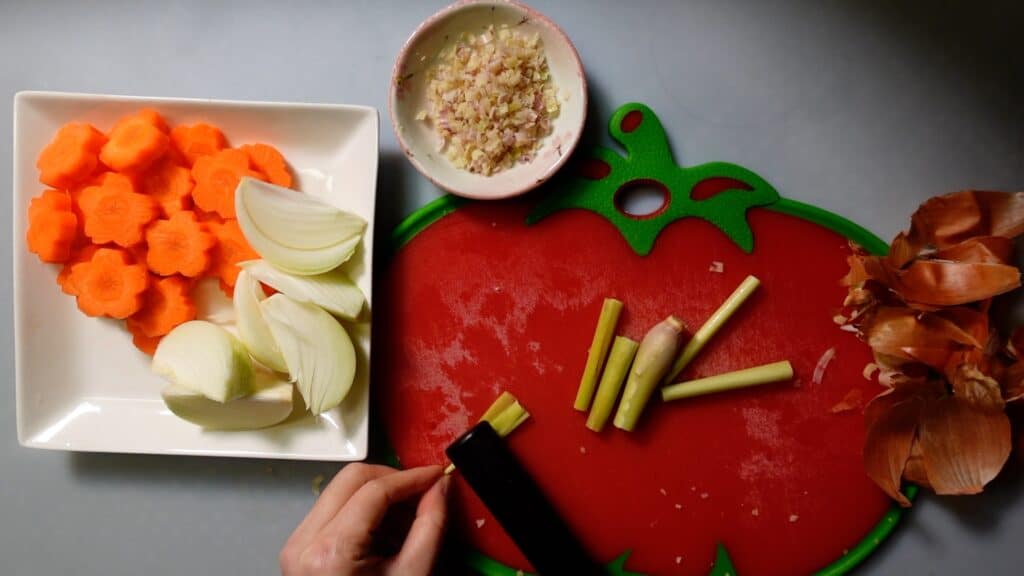 レモングラスの残りの部分は、包丁の柄などを使って、叩き潰します。