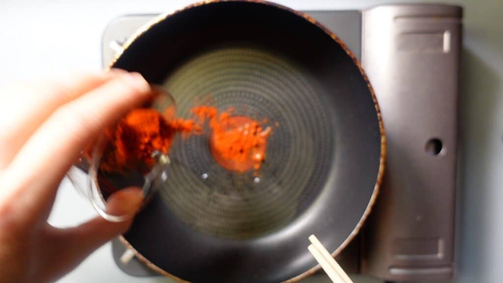 フライパンにサラダ油大さじ1を引き、パプリカパウダー小さじ2分の1を入れます。