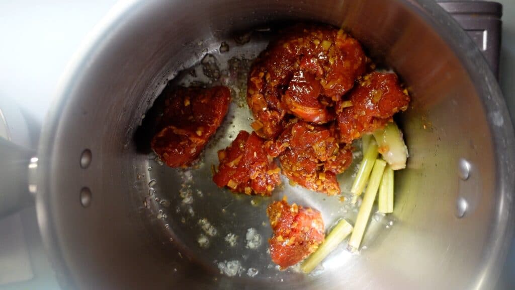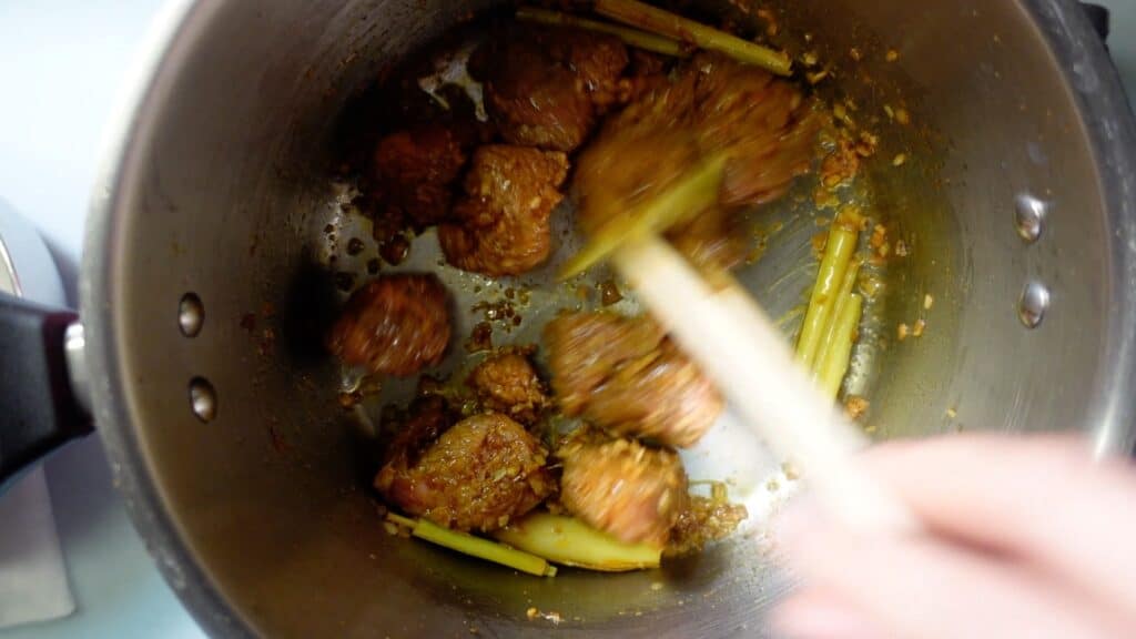 さらに、ターメリックパウダー少々、砂糖小さじ1、鶏ガラスープの素小さじ1、パプリカパウダー少々、五香粉小さじ1、みじん切りにしたレモングラス、サラダ油大さじ1を加えます。