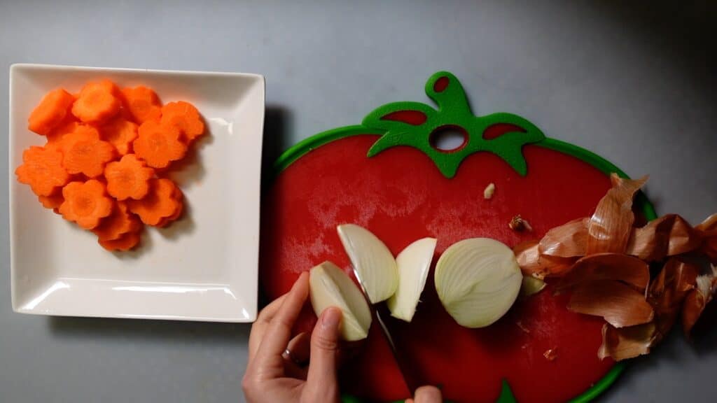 玉ねぎは皮を剥いて、大きめにくし切りにする。