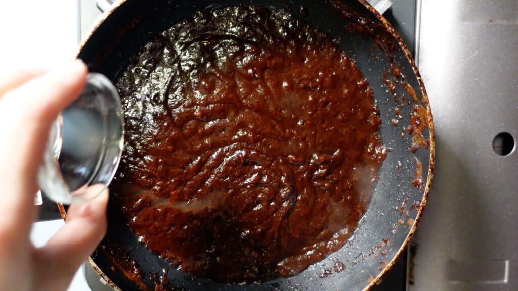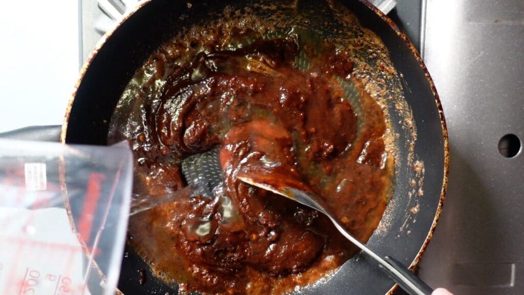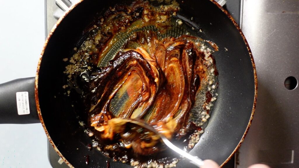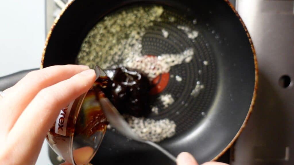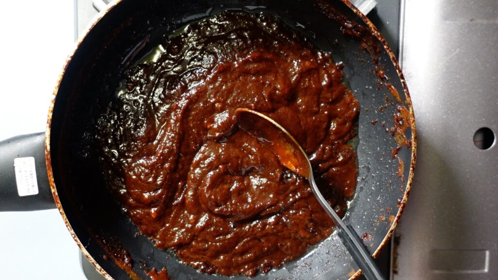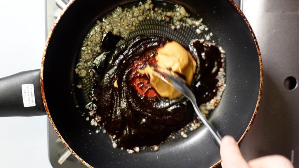 ニンニクの香りが出てきたら、甜麺醤大さじ2を入れます。