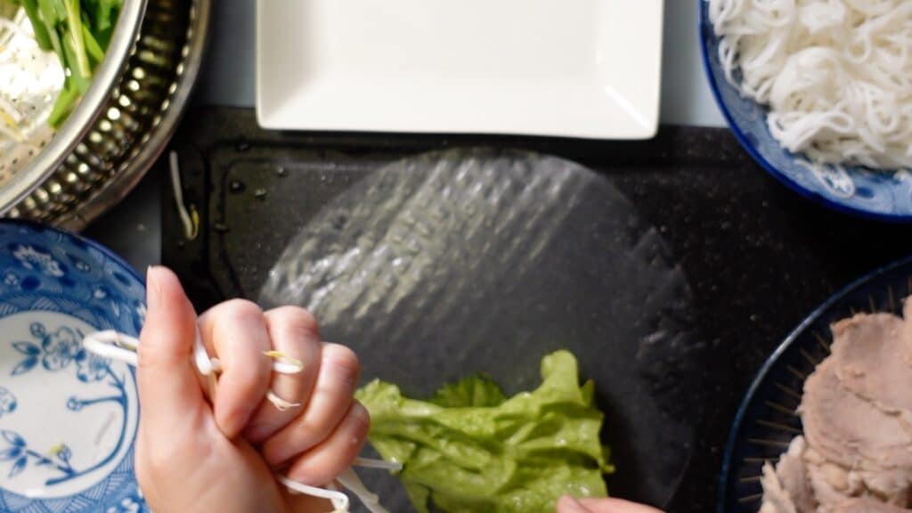 もやしはそのままだとライスペーパーに穴を開けてしまうかもしれないので、手で軽く握りつぶした上で、レタスの上に置きます。