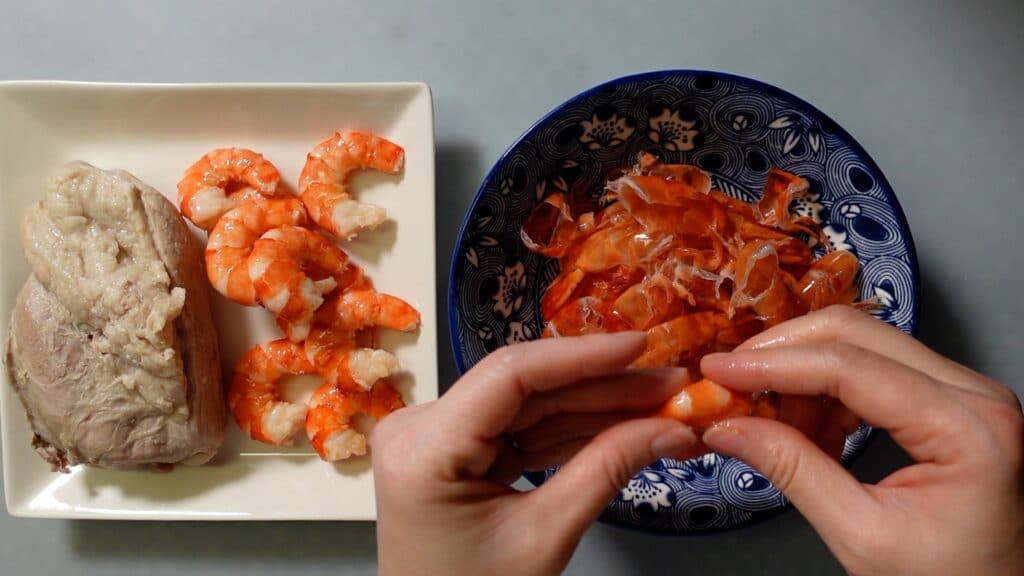 茹でたエビは殻を剥きます。