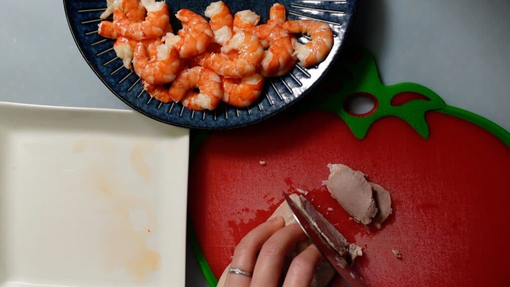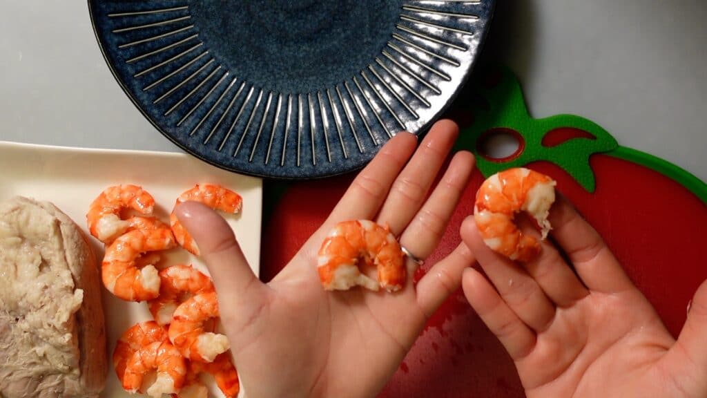 エビはさらに半分に切ります。