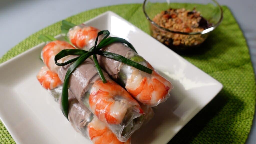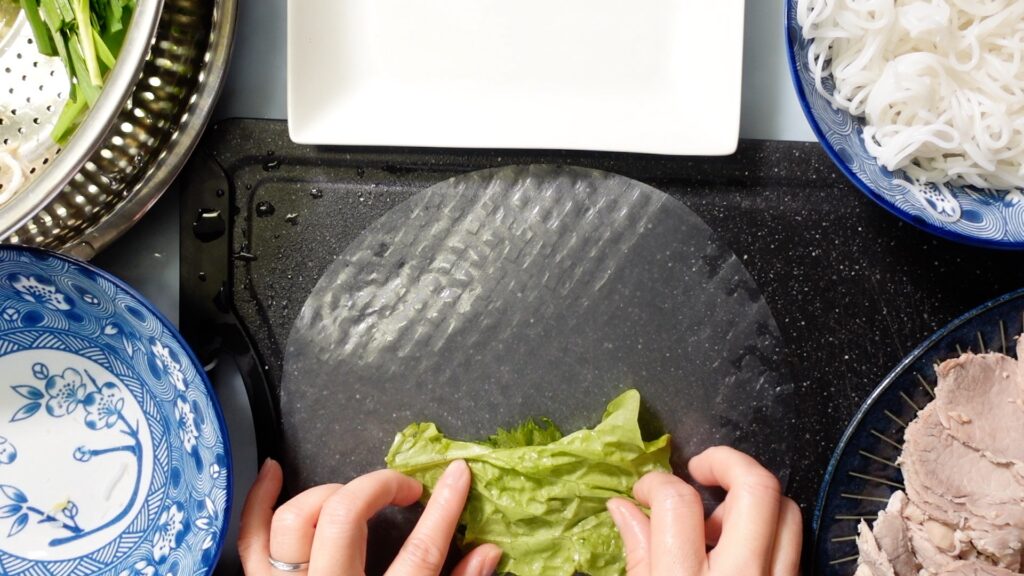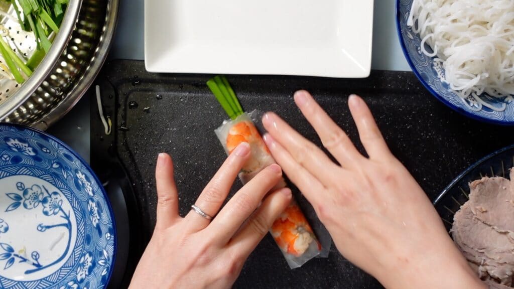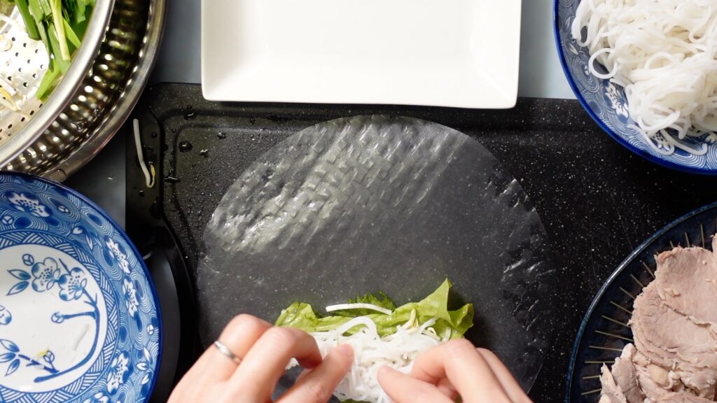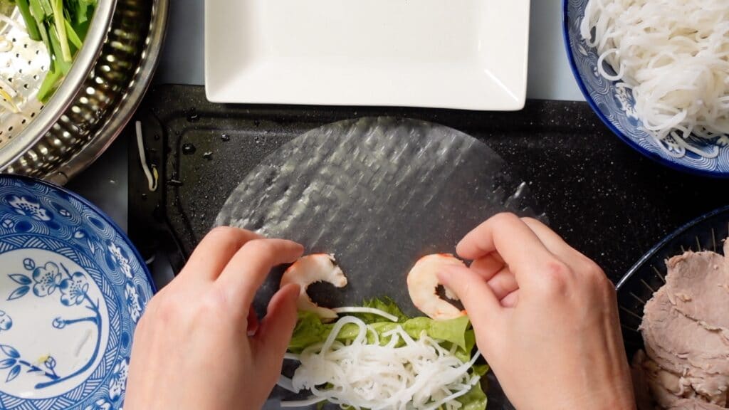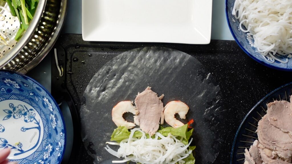 エビ、野菜、麺などをライスペーパーで巻くだけの簡単そうな料理なのですが、実は上手に巻くのは結構大変です。