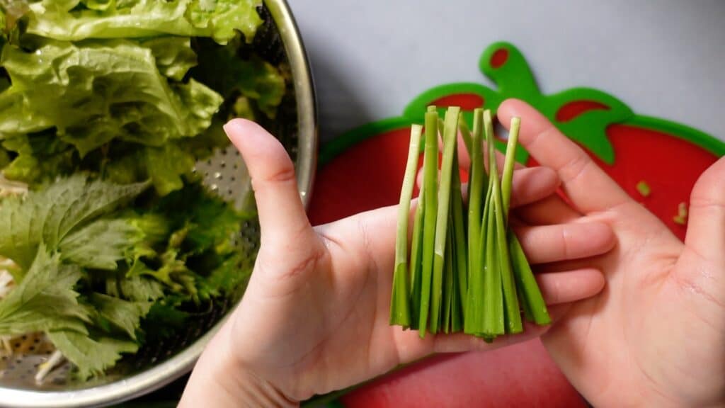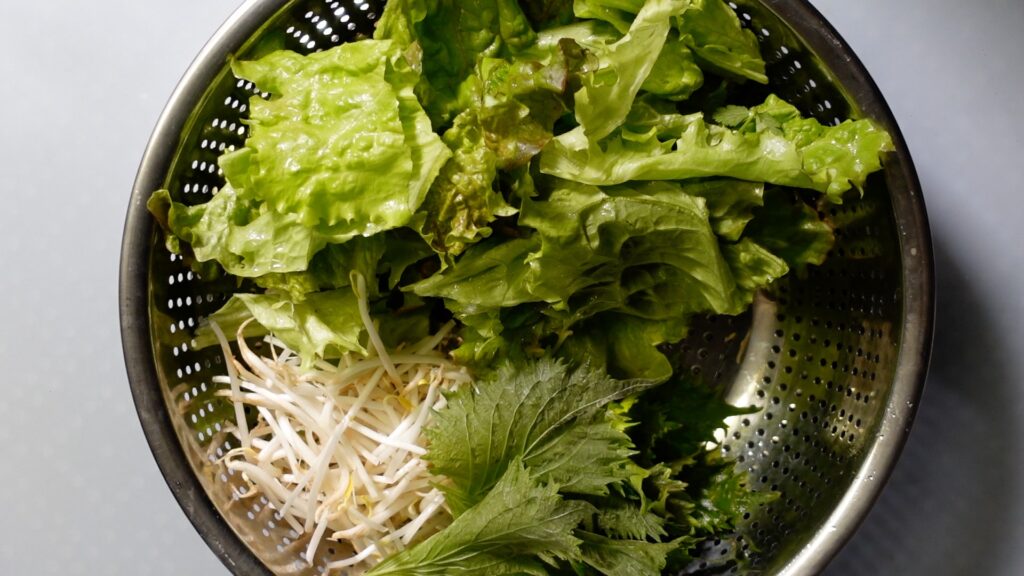中に入れる野菜はレタス、もやし、大葉などです。