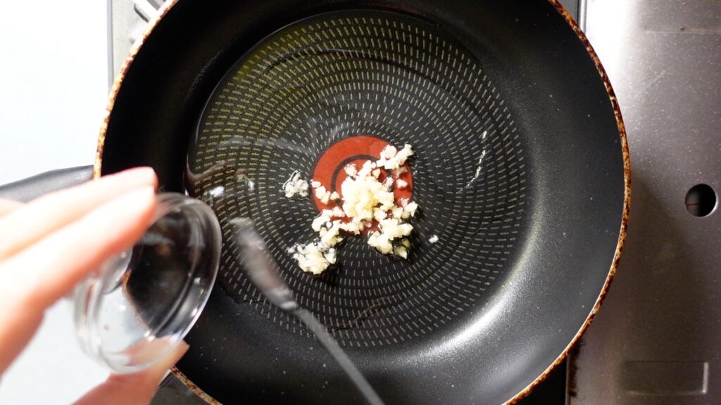 まず、フライパンに油を引き、みじん切りにしたニンニクを炒めます。