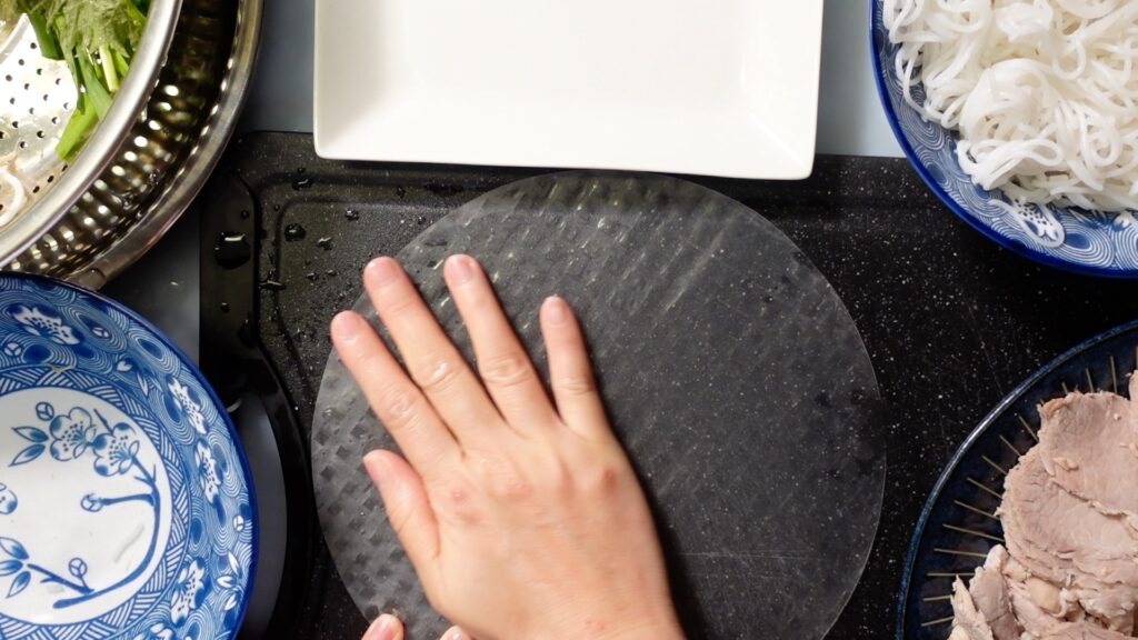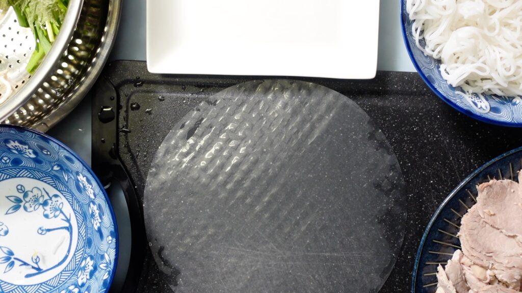 凸凹した麺を上にしてライスペーパーを置きます。