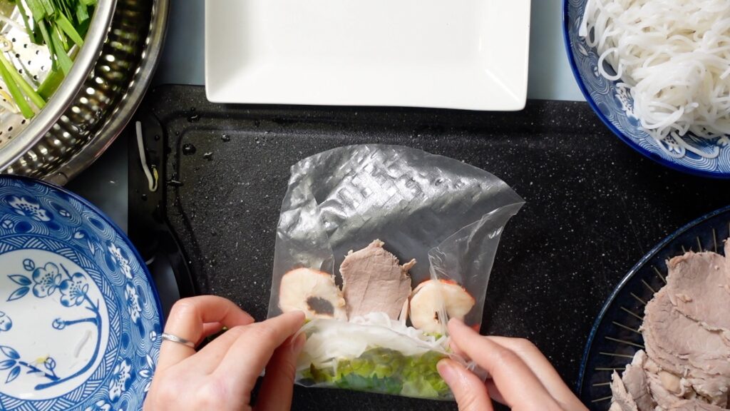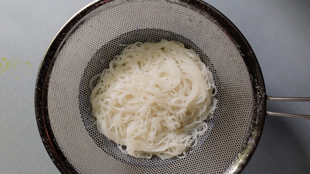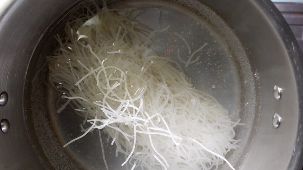 ライスヌードルを茹でます。茹で時間は使用する麺の袋の記載に従ってください。