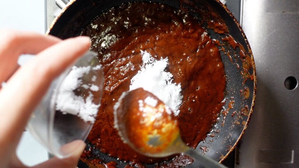 水分が飛んで、ペースト状になってきたら、砂糖大さじ1を入れます。