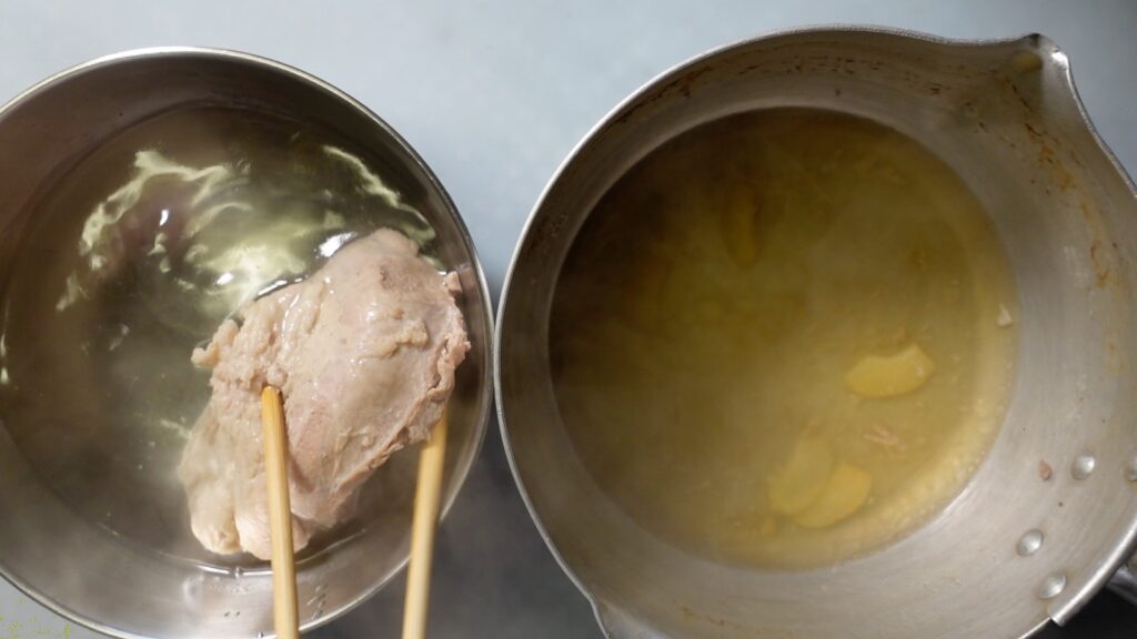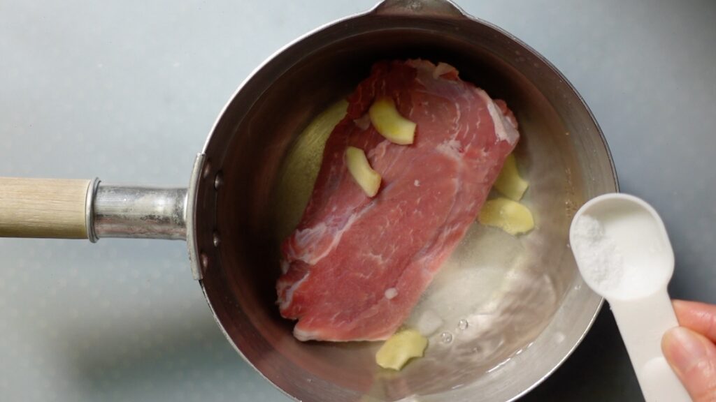 豚肉は、薄く切った生姜数枚と塩を入れて茹でます。