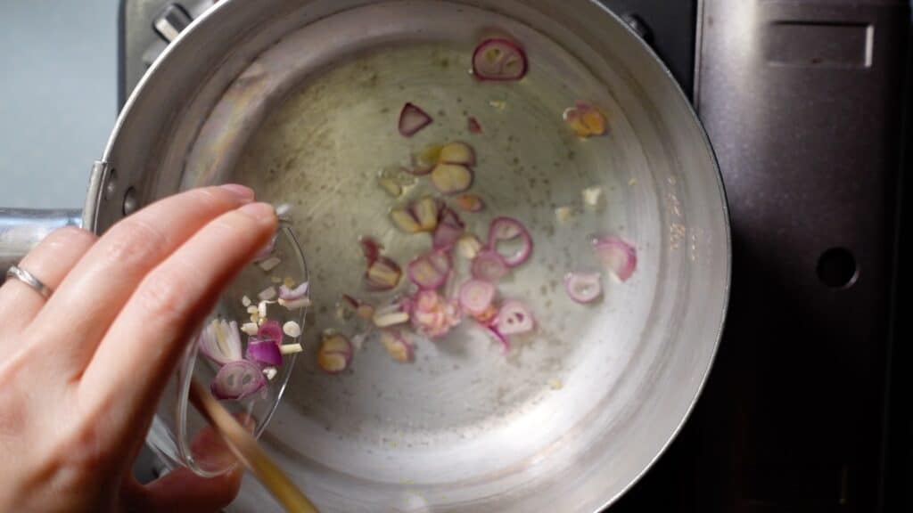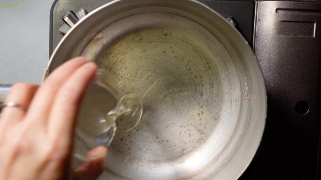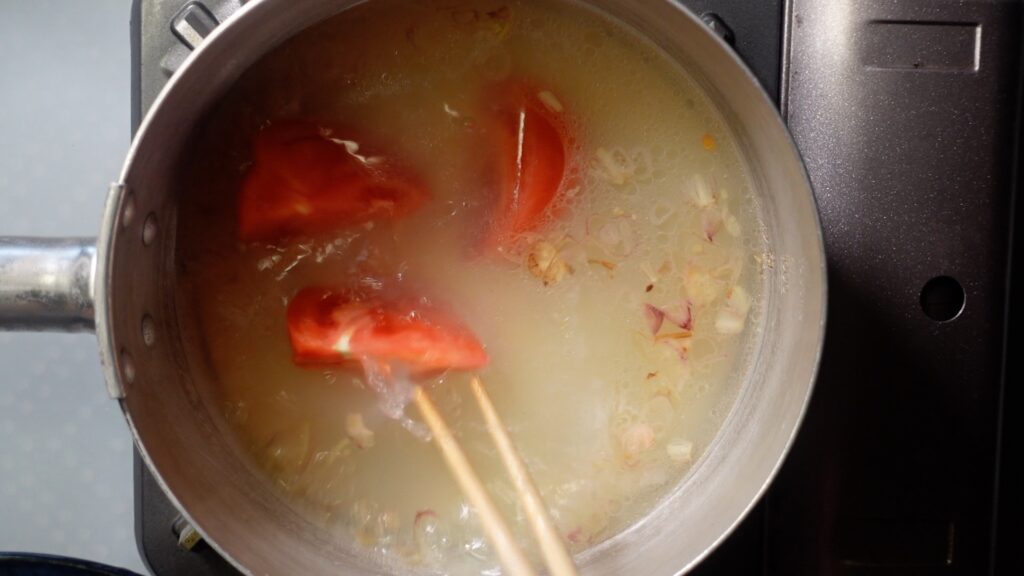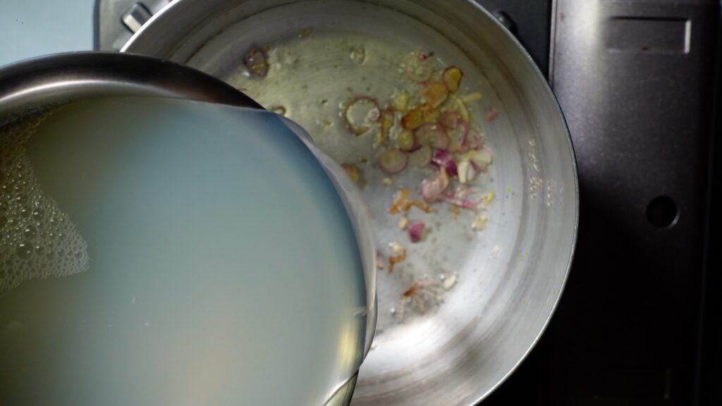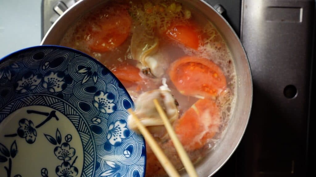香りが出てきたら、ハマグリの煮汁を入れます。