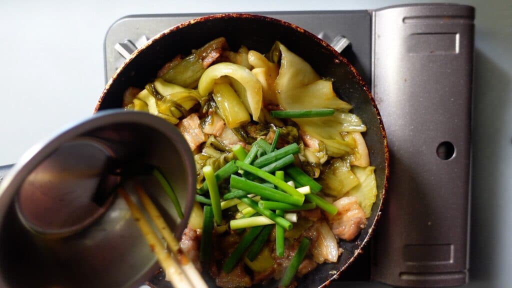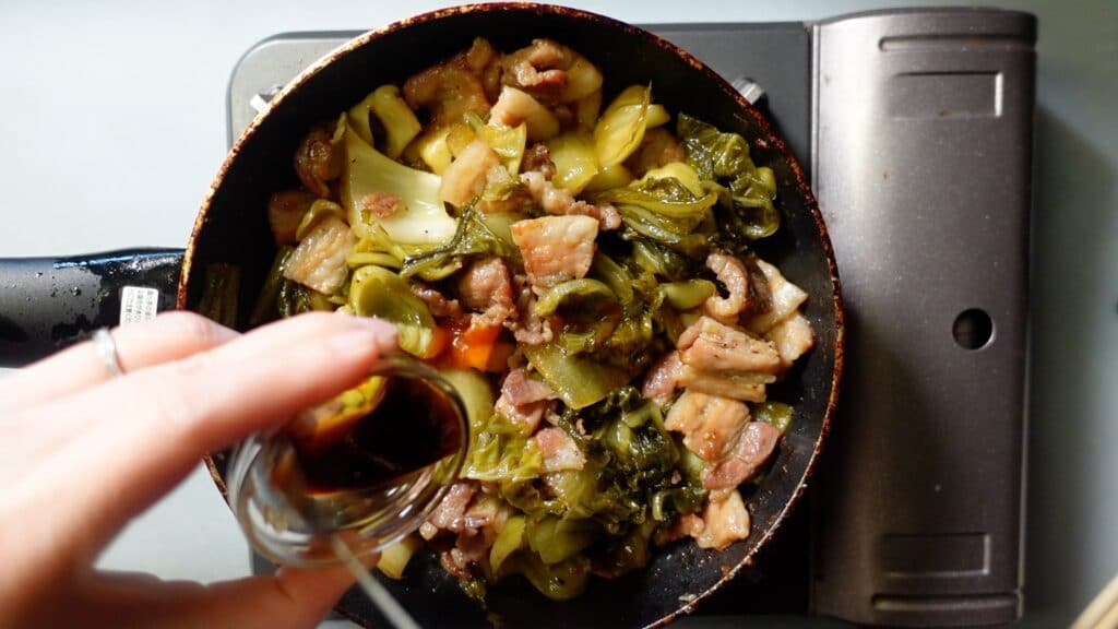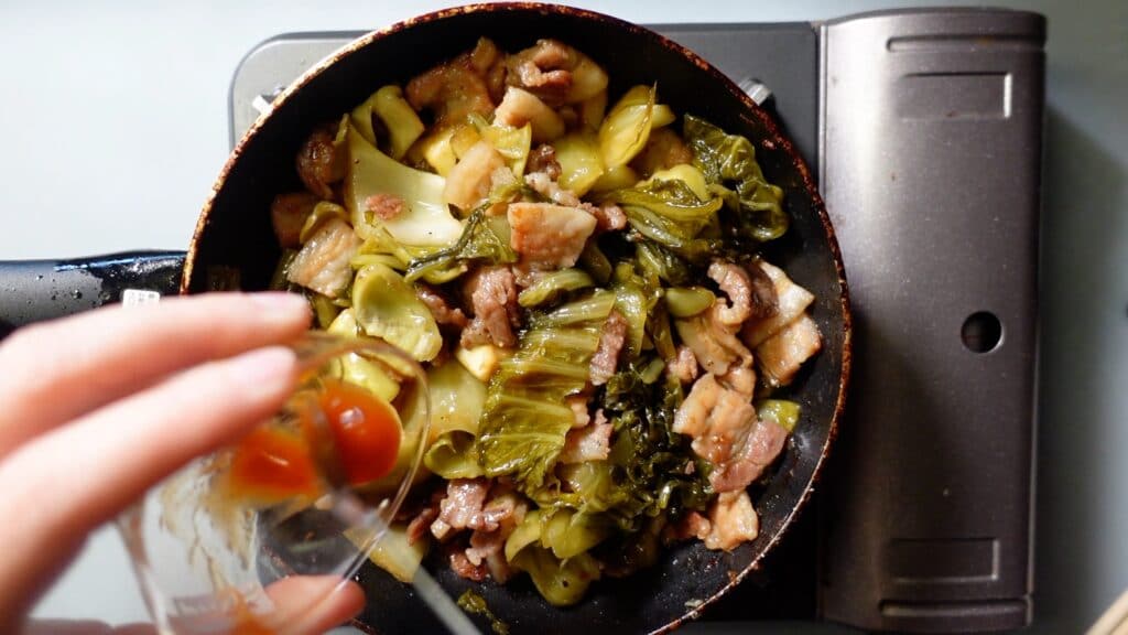 高菜漬けに火が通ったら、チリソース小さじ2分の1を入れます。