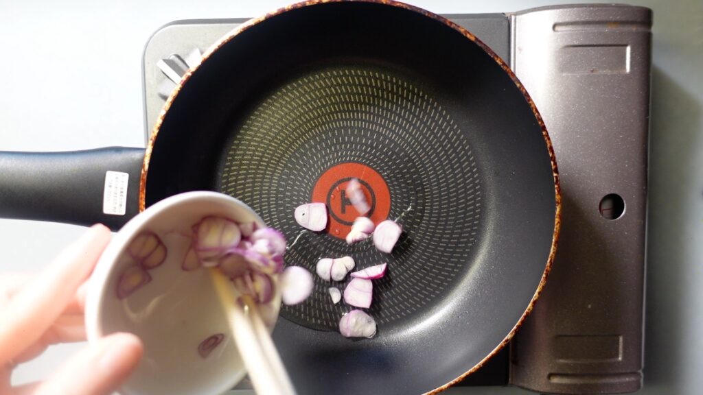 フライパンに油を引き、ホムデンを炒めます。