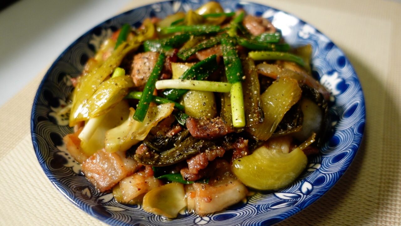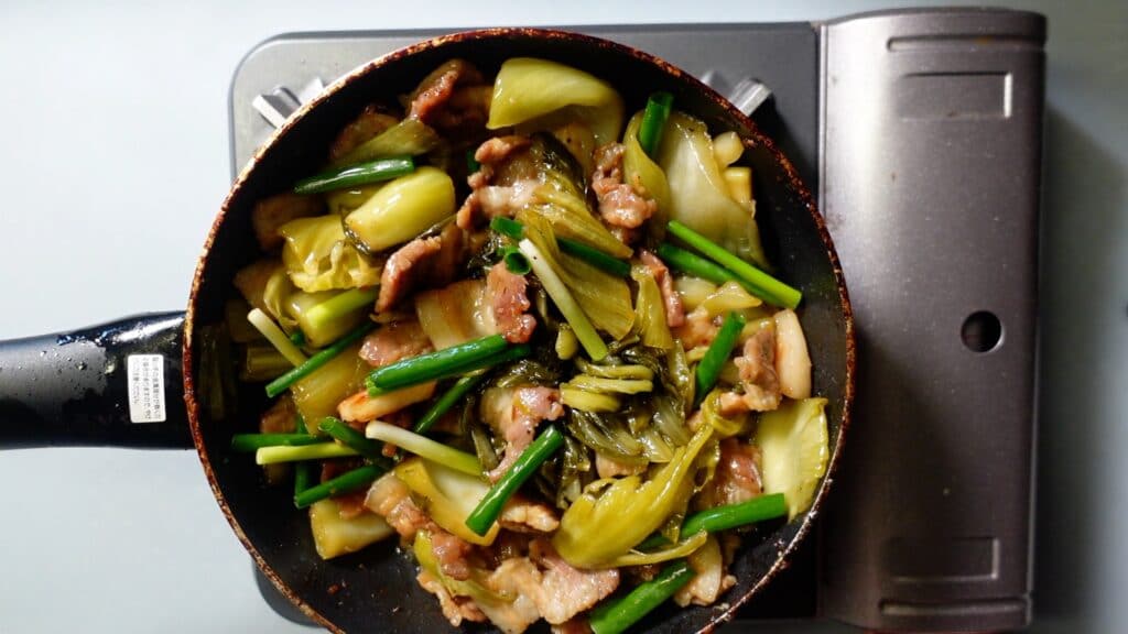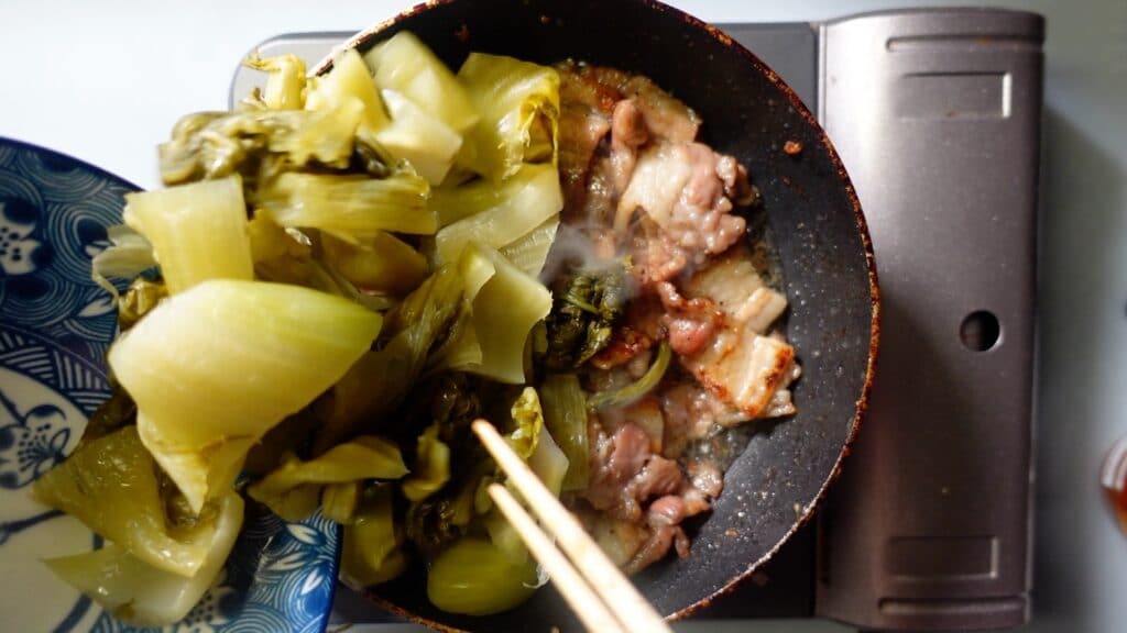 「高菜漬けと豚肉の炒め物」の作り方