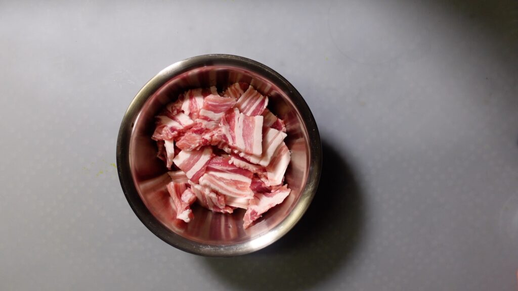 豚バラ肉は、スーパー等ですでに切られたものを買ってもいいですし、好みの厚さにしたいならば、豚バラブロックを買って、好みの厚さに切りましょう。
