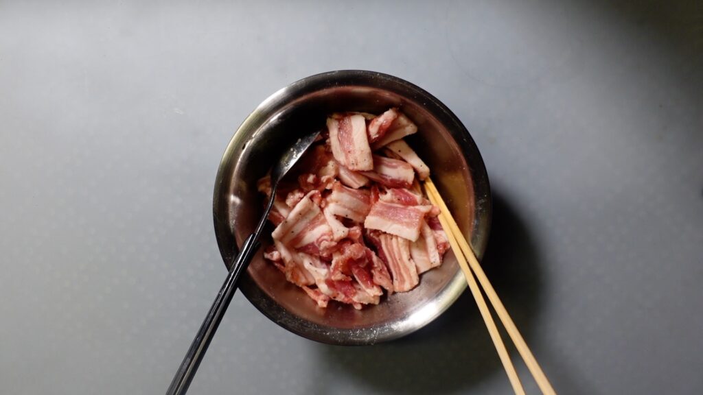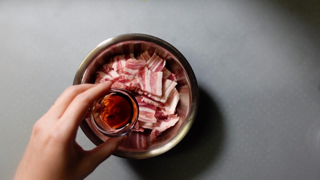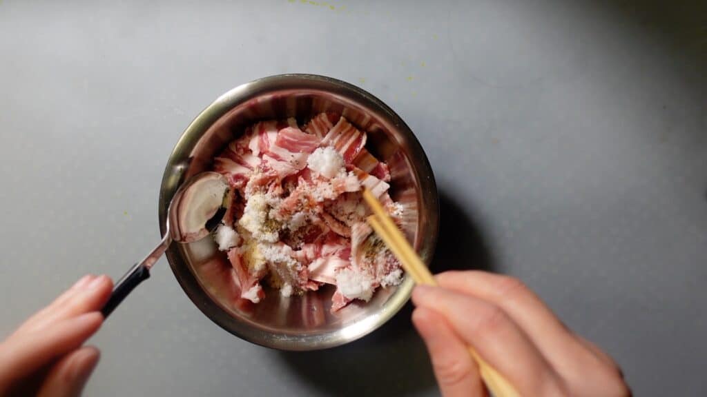 豚バラ肉をボウルに入れます。