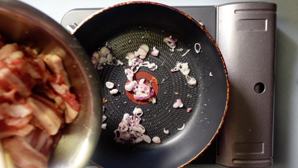 ホムデンは薄切りにしておきます。ホムデンがない時は、ニンニクを代わりに使ってもOKです。