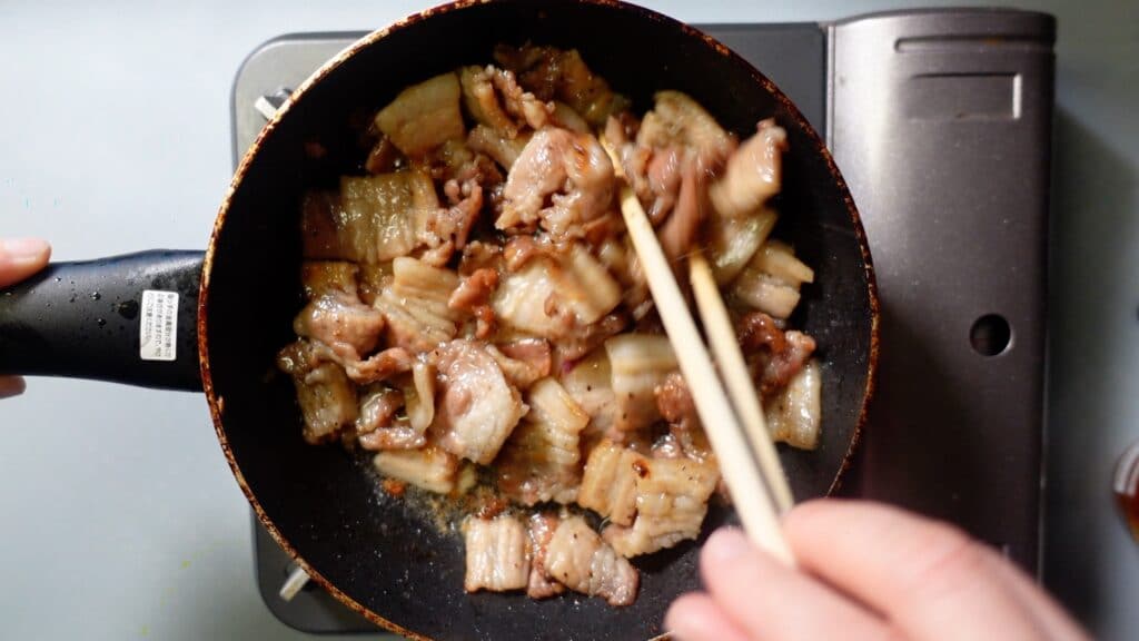 豚肉に火が通るまで炒めます。