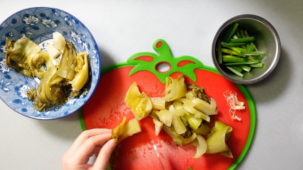 高菜漬けを食べやすい大きさに切ります。