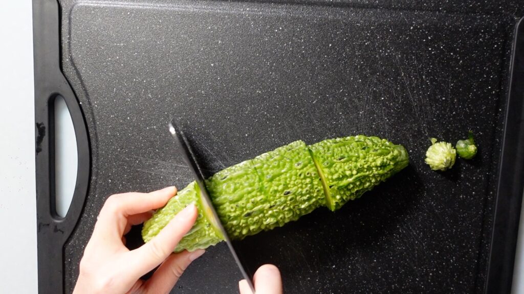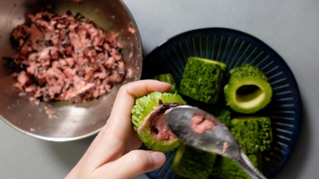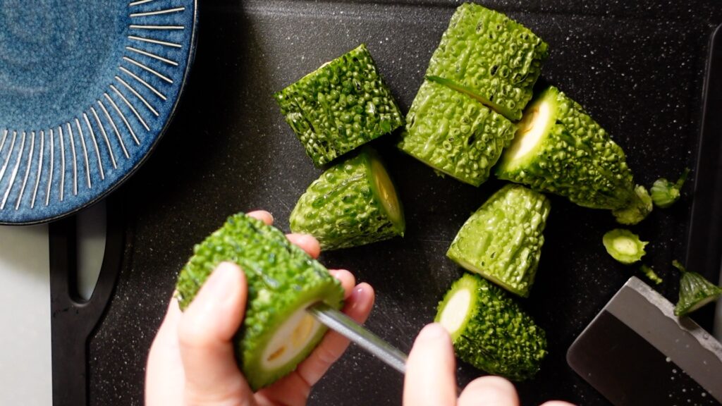 スプーンの柄の部分を使って、ゴーヤのわたを取り出します。