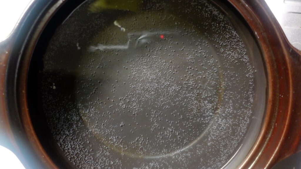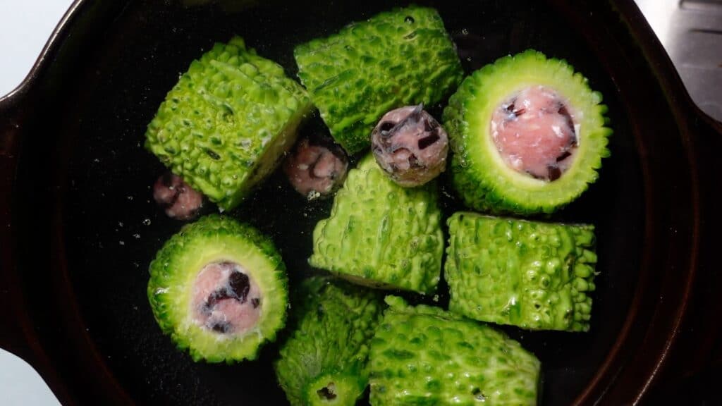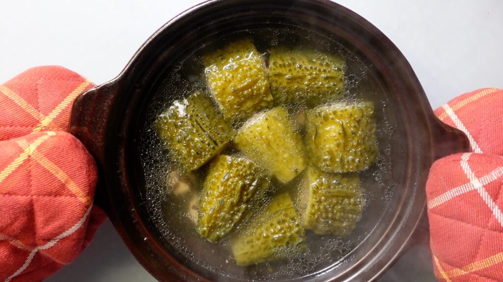 15分ほど煮ます。火力によって時間は変わります。煮すぎるとゴーヤが柔らかくなり過ぎてしまいますので、豚肉に火が通ったかで判断するようにしましょう。