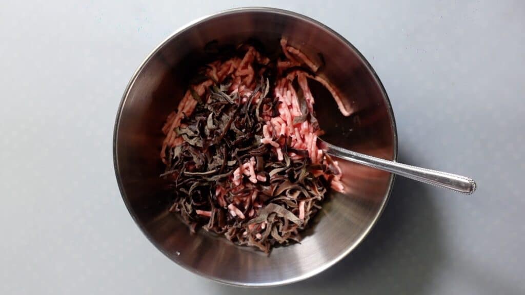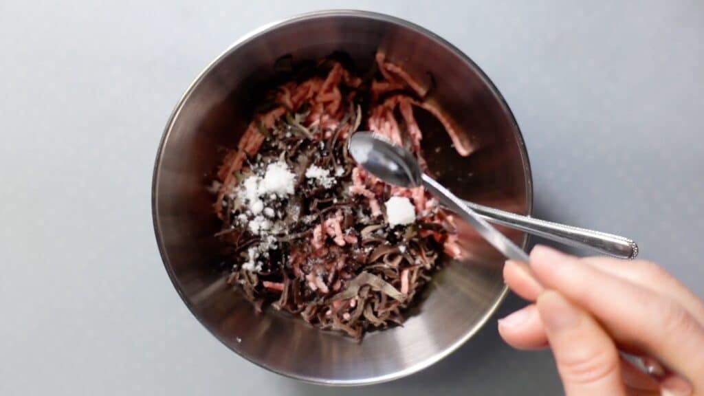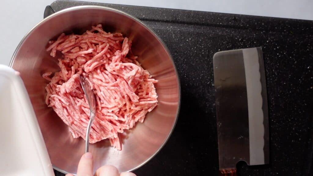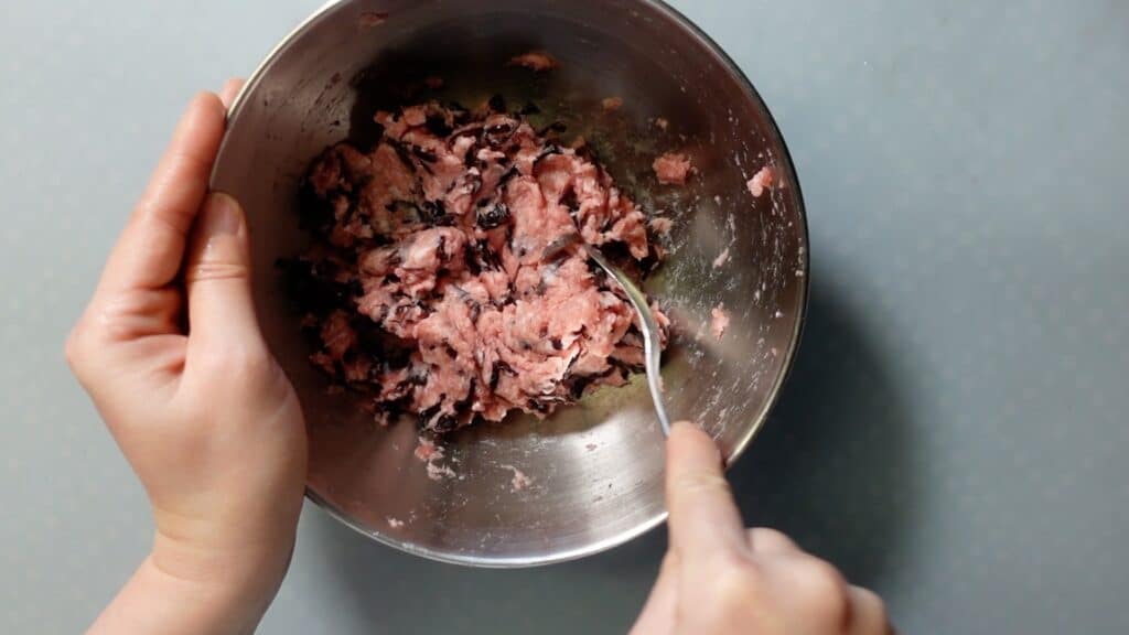 ひき肉を潰すようにしてしっかり混ぜます。しっかり混ぜることで、ひき肉がバラバラにならなくなります。